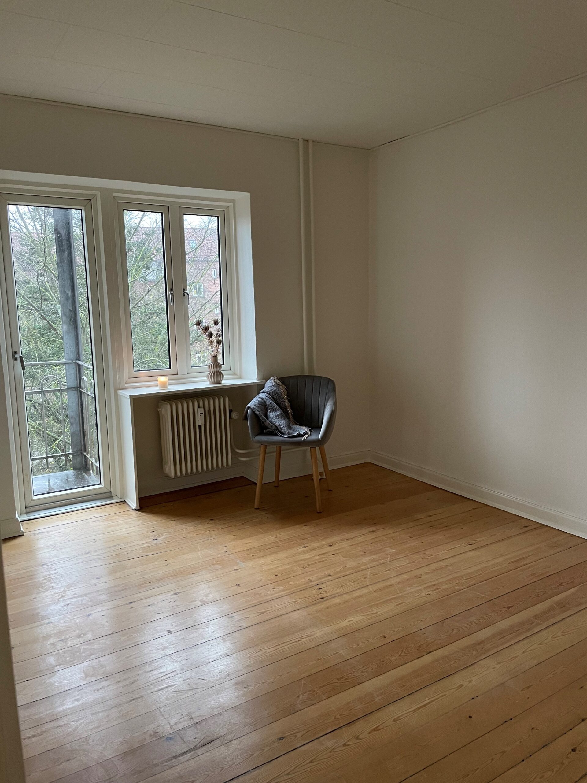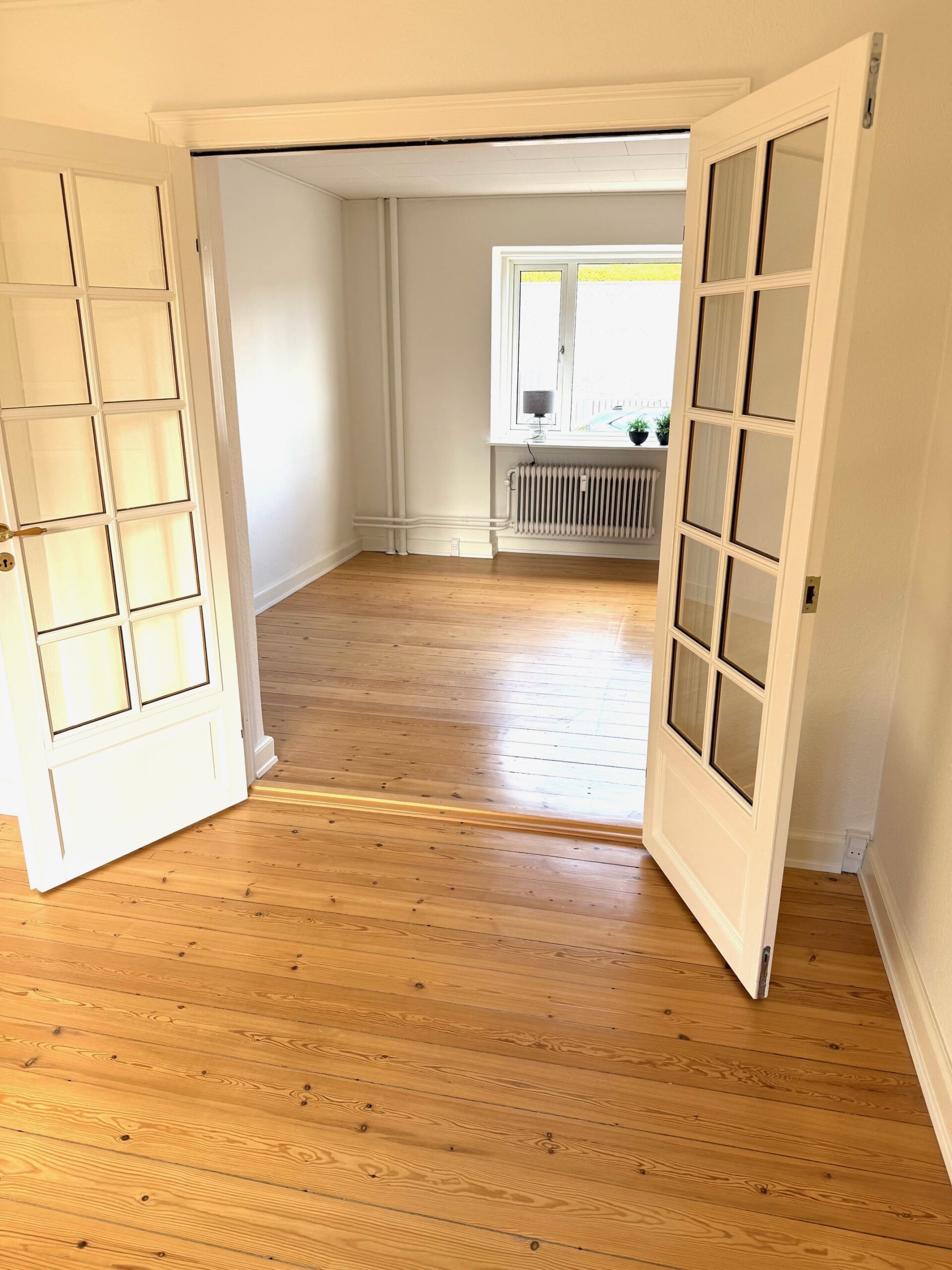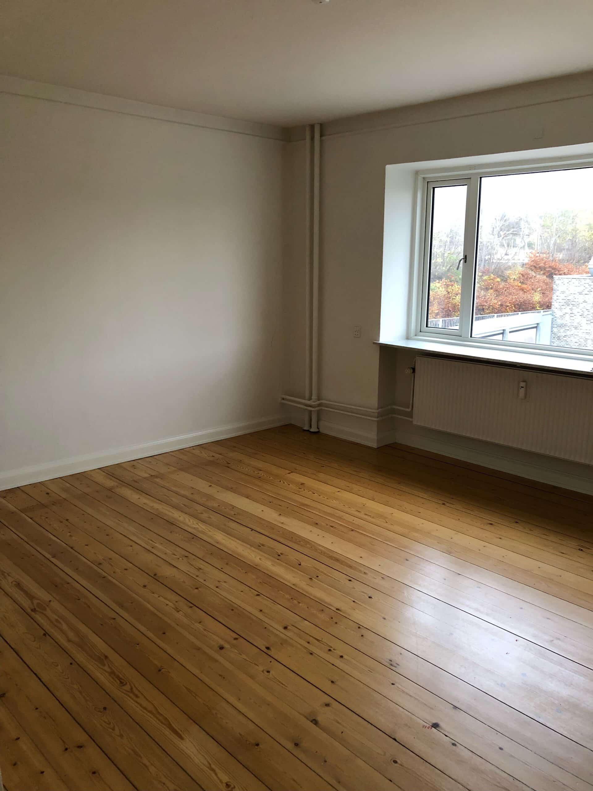 Lejligheden har et godt lysindfald, lyse trægulve og hvide vægge og lofter.