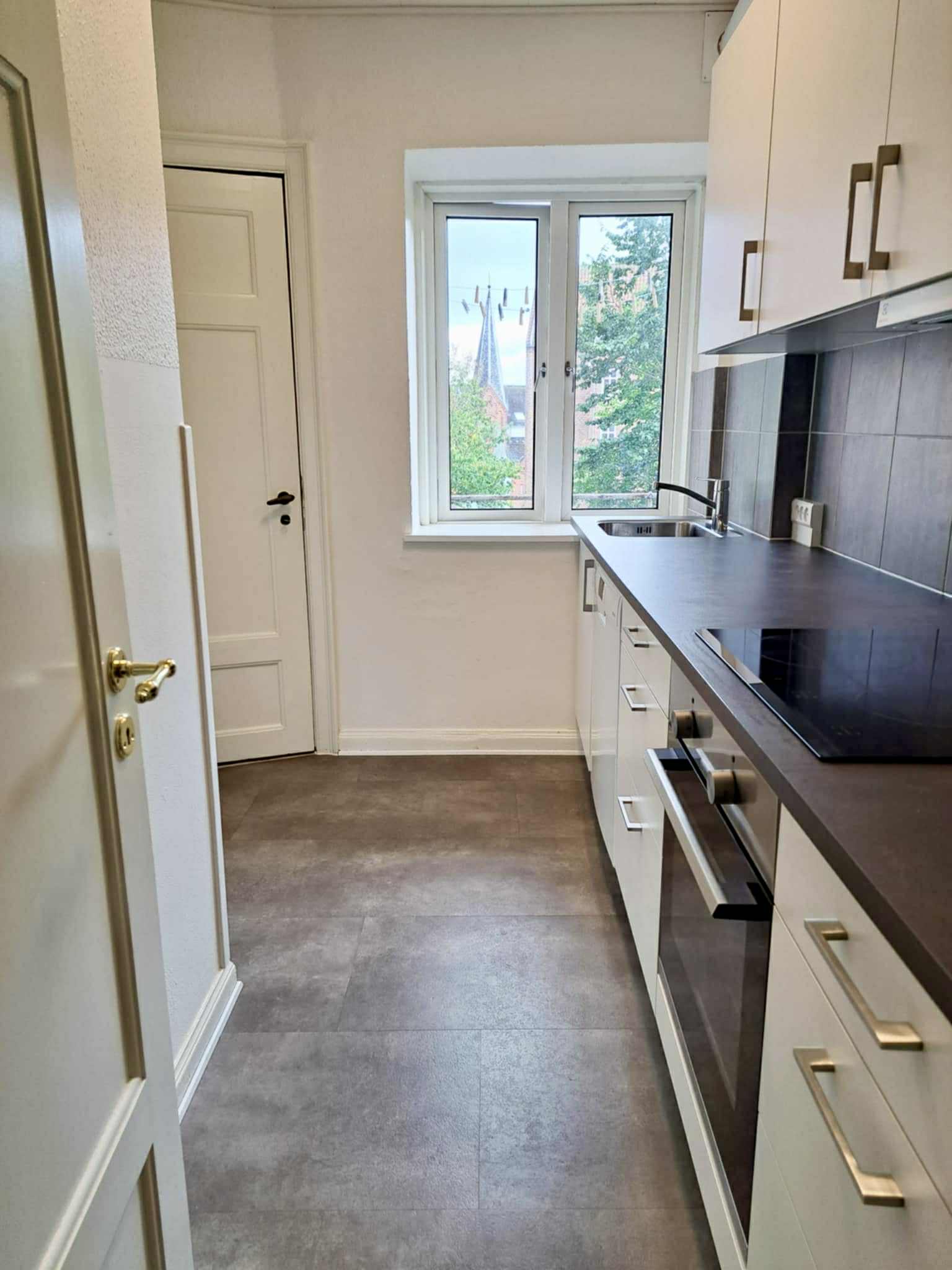 Lejlighedens fordeler gang åbner op til nyt køkken med hvidt inventar, opvaskemaskine og køle-frys, lyst badeværelse, rummelig stue og soveværelse med udgang til altan.