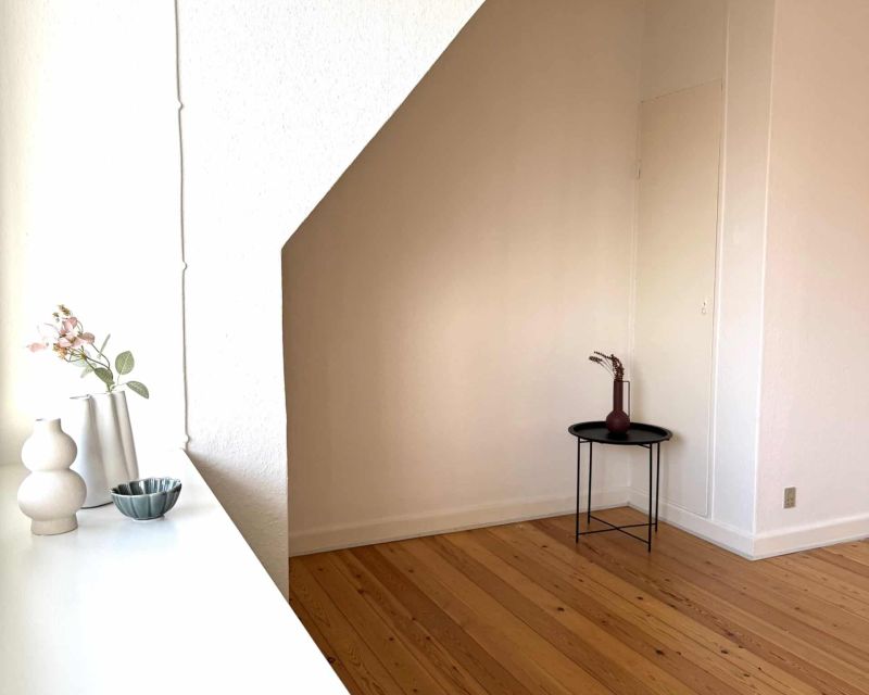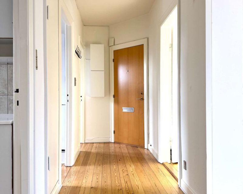 En dejlig lys lejlighed med fordeler gang til køkken, badeværelse, to værelser, soveværelse og stue.