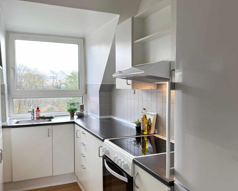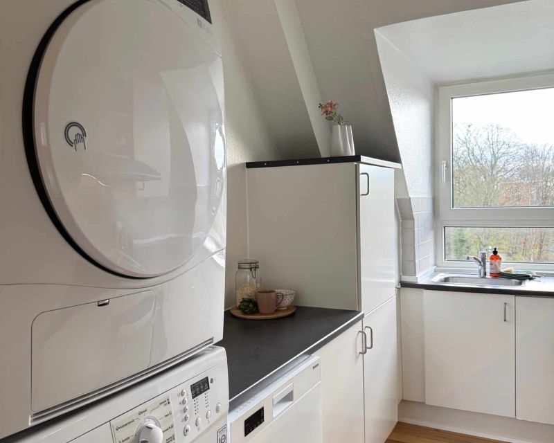 Lejligheden har et lyst køkken med komfur, køle- fryseskab, emhætte, opvaskemaskine og vaskesøjle med vaskemaskine og tørretumbler.