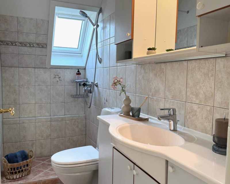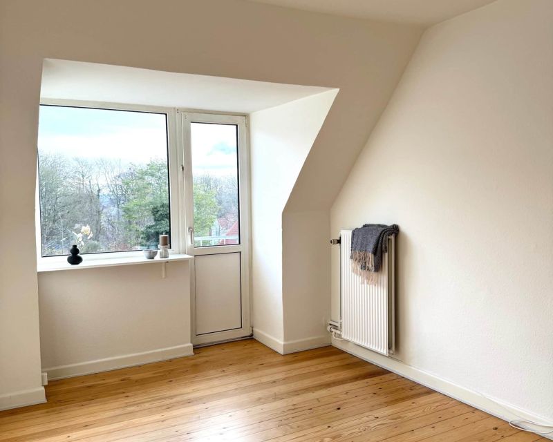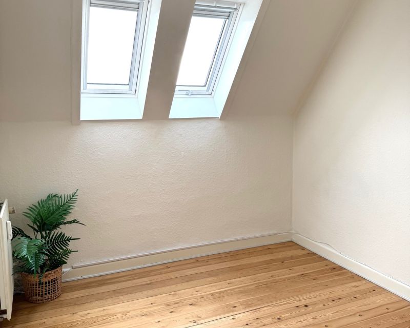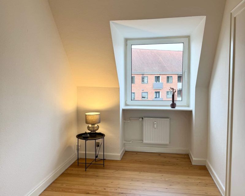 Soveværelset har en god størrelse og et godt lysindfald, med en lille terrassedør, med et trin ud mod det grønne område. Det ene værelse har to skråvinduer, som giver et fint lysindfald.