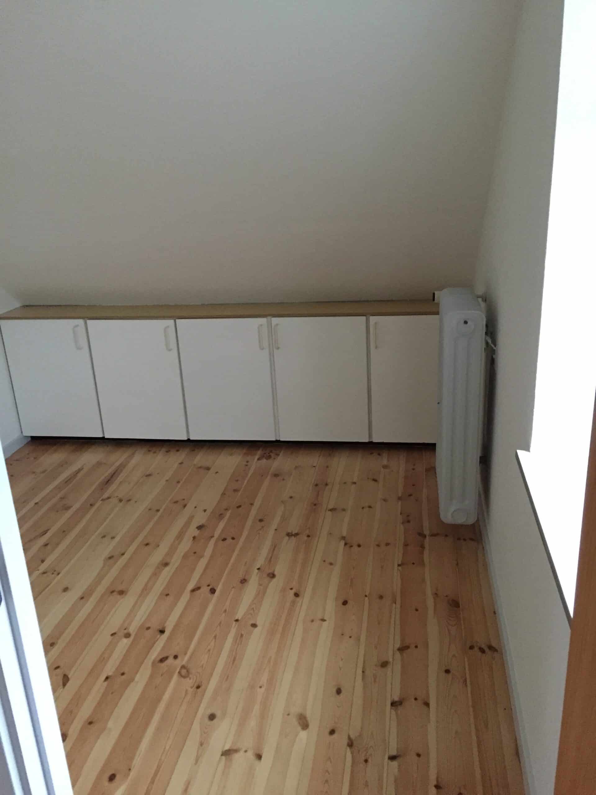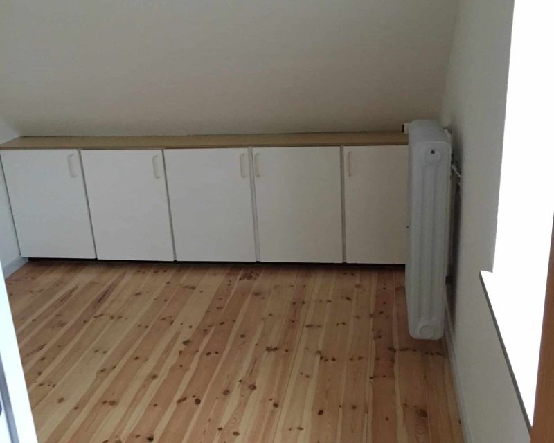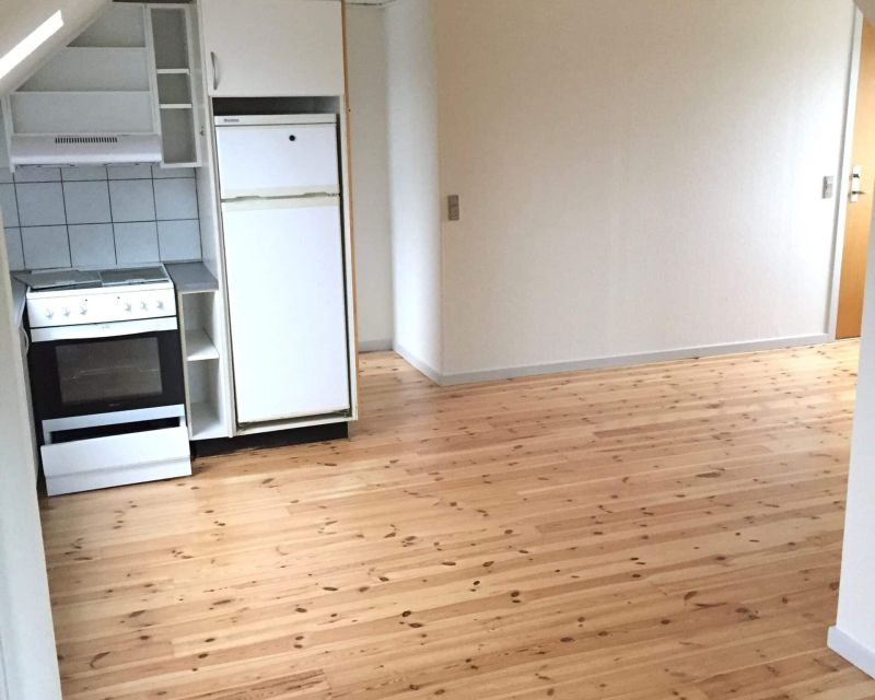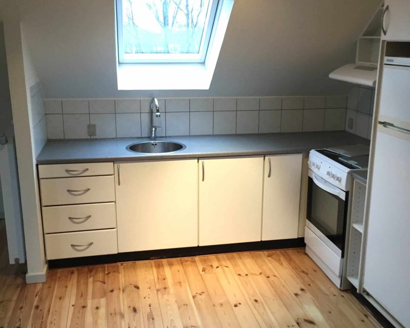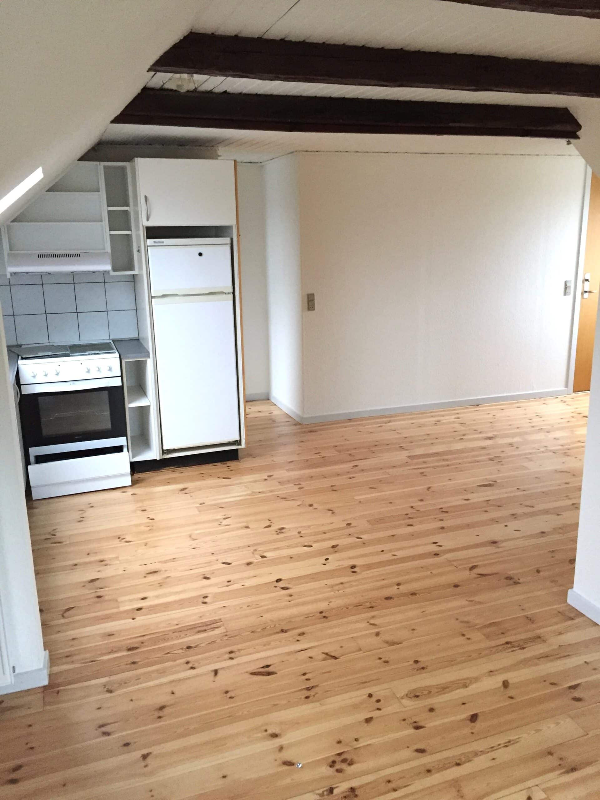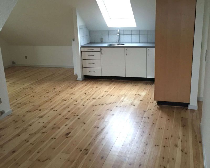 Lejligheden har en god ruminddeling med lyst køkken i åben forbindelse med stuen, soveværelse og badeværelse. De synlige bjælker giver et charmerende og hyggeligt indtryk.