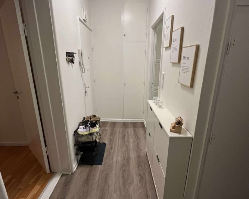 Lejligheden er godt indrettet med entré der danner en fordeler gang, med adgang til badeværelse, opholdsrum og køkken. Der er træ laminatgulve i lejligheden og hvide lofter.