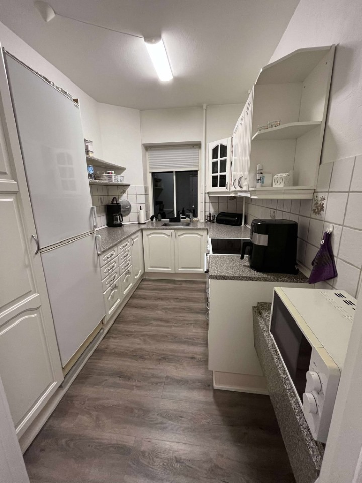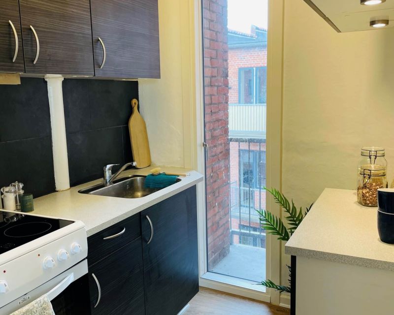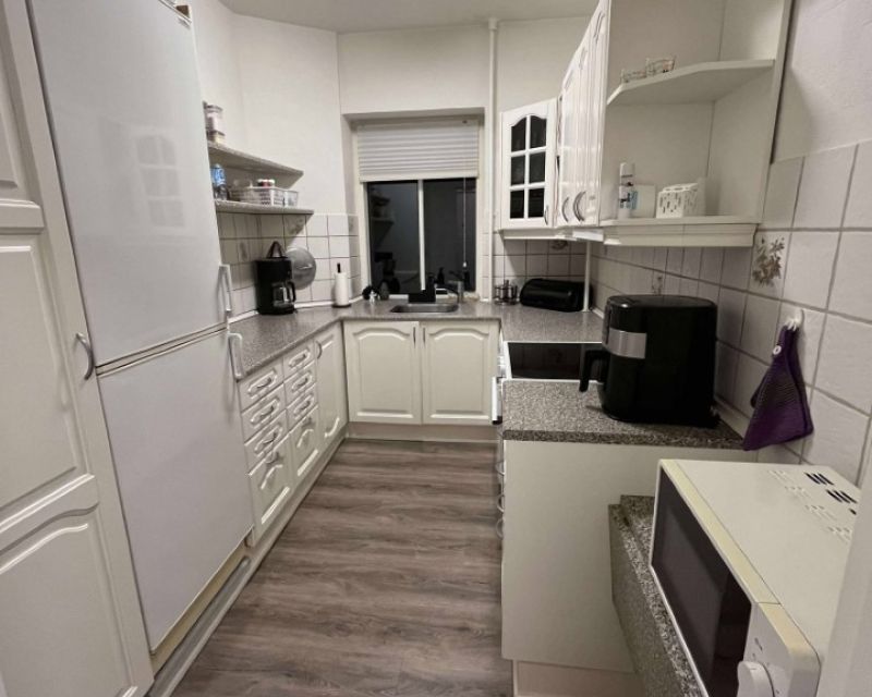 Lejligheden er godt indrettet med fordeler gang med indbygget skabe, der åbner op til hvidt køkken med god opbevaringsplads.