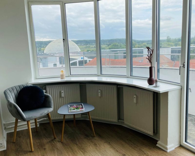 Fra opholdsrummet er der adgang til rummelig altan, hvor der er plads til lille bord og stol og med den fineste udsigt over Randers mod Randers Regnskov.