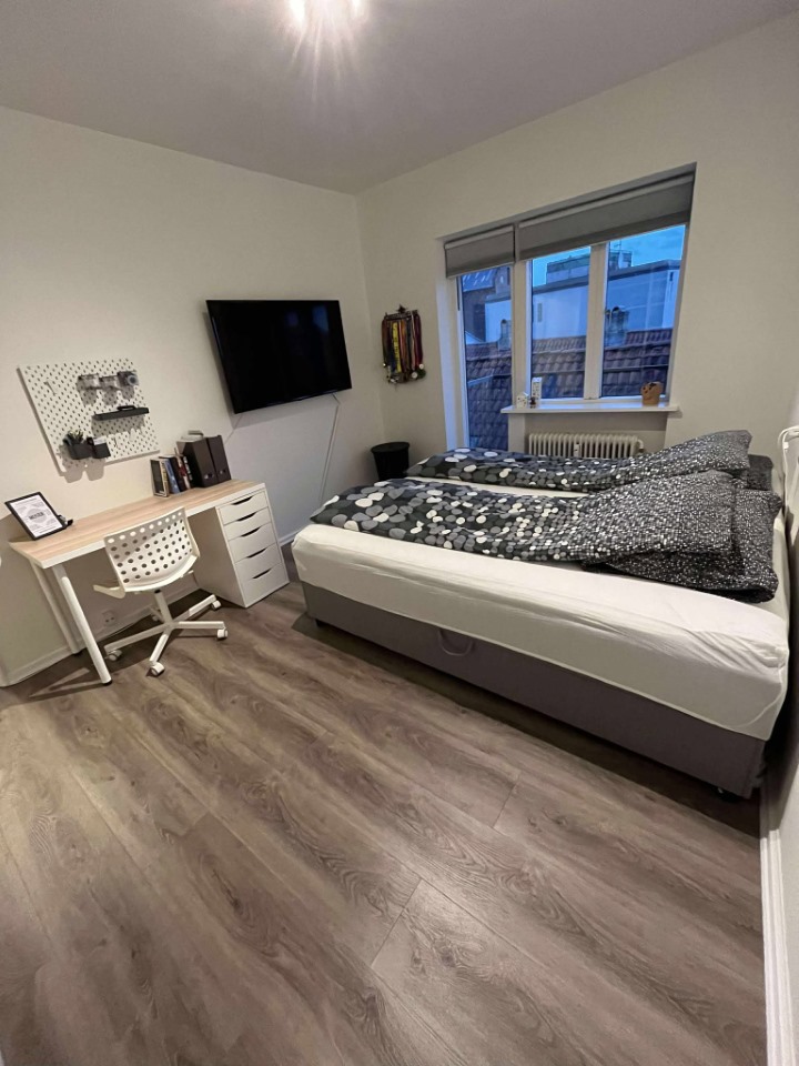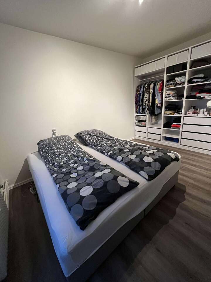 Soveværelset er rummelig med plads til tøjskab og evt. lille kontorplads. Stuen er ligeledes rummelig med plads til både sofaarrangement og spiseplads.